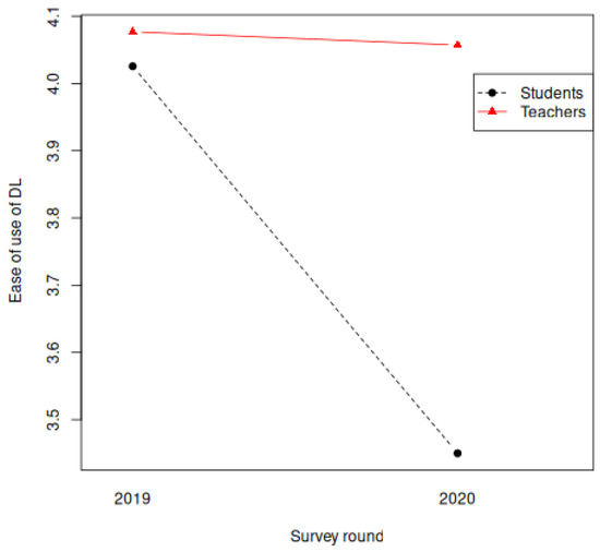 Teachers and students both lowered their perceptions regarding ease of use of DL; this decrease was greater among students (from M = 4.03 to M = 3.45) than among teachers (from M = 4.08 to M = 4.06) (Figure 6).