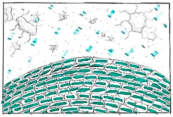 Ben (Figure 3) drew leaf cells, bacteria, germs, and dust. “So, you will be like… see the cells… and around it will be all kinds of groups of germs or bacteria and dust and all kinds of small things that are difficult to see normally”. His drawing also reveals his alternative conceptions concerning differences in scale—the germs and bacteria are large, relative to the cells, whereas in reality, bacteria are one-cell organisms. Ben was aware that the light would be refracted because of the drop of water, but he was not sure how to represent it. “I had a thought that maybe I’ll see… that the light would refract slightly because of the water. But in the end, I didn’t draw it like that”. Nonetheless, the convex shape of the grass cells in his drawing shows the effect of the convex shape of the drop.