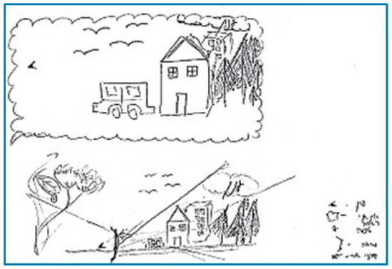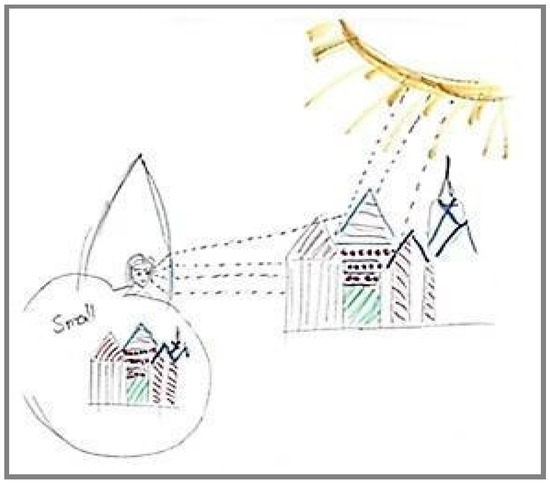 Gillian’s drawing (Figure 11) shows light rays emitted from the sun hitting houses, being reflected back to the external surface of a drop of water, and then being refracted to the observer’s eye on the left. The eye is enlarged beneath the seeing figure, within which a diminutive image of the objects is formed. This interpretation of the drawing is strengthened by the interview. “The light rays that hit the objects afterward are in the drop of water, and the rays reach my eyes through the drop and are distorted when traveling from the drop to my eyes.” However, she seems unsure about the size of the figure. On the one hand, she says “The figure is enlarged and is situated in a different location from the real place … the distances are different”. On the other hand, she writes “Small” in English on the drawing, implying that there will be a reduction in size.