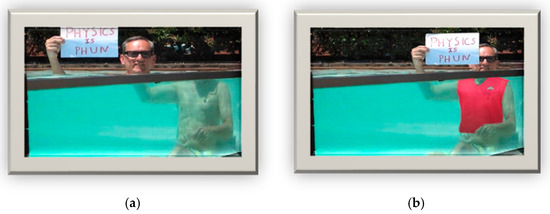 The second task, which was also based on Hewitt (1993), began by asking the students to look at two photographs of a man in a pool with a transparent wall (Figure 6a,b). Both photos were taken with a side view. In one of them, it appears as if the man’s head is disconnected from his body. The students had to determine which of the two photographs was fake.
