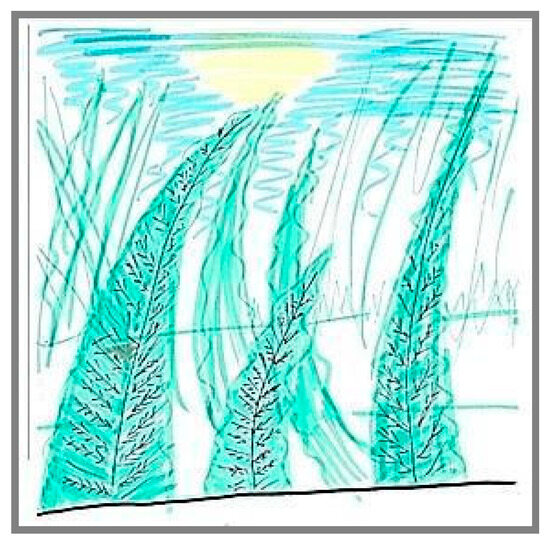 After learning, Hanna (Figure 8) drew lines that she described as representing light rays. The vertical lines come down from the sky (not from the sun, although she drew it). She drew horizontal lines in the background, perhaps representing the side of the drop. Thus, the figure shows the distribution of light rays and a change in direction. The leaves tend to bend to the right, seemingly representing the effect of the convex structure of the drop on the image of the leaves. In her oral explanation, she specifically referred to the refraction of light and included the enlarged image. “After we learned about optics, I know that when light passes through different materials, it changes direction. When light passes through water, then the light rays are distributed and increase the size of the object”. None of that appeared in her first drawing.