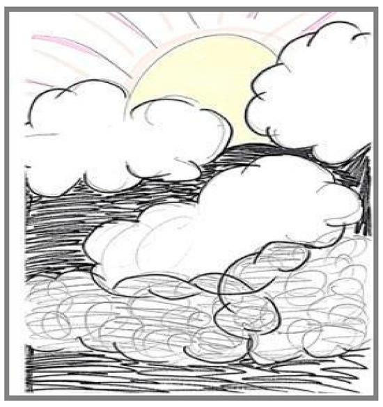 Hanna’s drawing (Figure 12), performed at the end of the unit, shows clouds in a dark sky and a large yellow sun with pink rays emerging above the clouds. Hanna explained that her thoughts are usually confused and heavy, but when she feels that she has understood something new, her heart lights up.