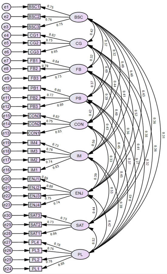 The reliability and validity of the DGBVL flow experience instrument were tested, and the results of a confirmatory factor analysis are presented in Table 2 and Figure 1. Specifically, all scales exhibited internal consistency and reliability, with Cronbach’s α and composite reliability (CR) scores above 0.70. Convergent validity was assessed by examining the factor loadings, which ranged from 0.647 to 0.887, and the average variance extracted (AVE) values of each variable, which ranged from 0.537 to 0.641, surpassing the threshold of 0.500. Therefore, the scales demonstrated strong convergent validity.