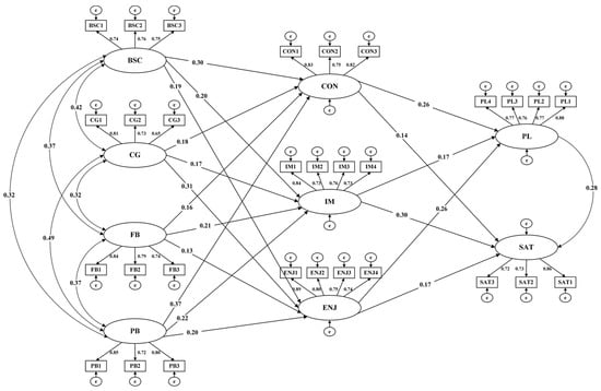 Regarding the effects of flow experiences, CON was associated with PL (β = 0.271, p < 0.001) and SAT (β = 0.130, p = 0.036). IM was related to PL (β = 0.180, p = 0.009) and SAT (β = 0.286, p < 0.001). ENJ predicted PL (β = 0.262, p < 0.001) and SAT (β = 0.156, p = 0.008). These results indicate that the constructs of flow contents positively predicted the constructs of flow outcomes. Regarding the effects of outcomes, there was a positive relationship between PL and SAT (β = 0.250, p < 0.001).