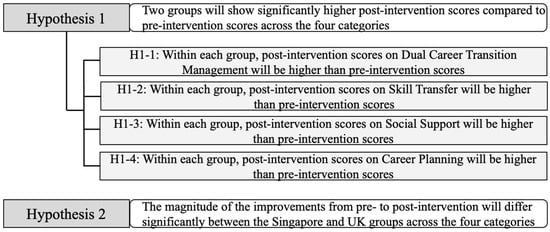 Drawing on empirical evidence from dual career research, which consistently demonstrates the measurable benefits of interventions on a psycho-educational curriculum package (Hong & Coffee, 2018), this research establishes Hypothesis 1. This hypothesis anticipates the presence of significant differences in the pre- and post-intervention effects within each group across four critical career-related categories. In addition, based on the experiential learning theory (Kolb et al., 2014), which posits that educational effect and learning are enhanced through experiences followed by reflection, and Hofstede’s (2001) cultural dimensions, which suggest that cultural variables (e.g., individualism and collectivism) influence educational outcomes, this study assumes the presence of significant differences in pre- and post-intervention effects between the participants in Singapore and those in the UK (Hypothesis 2). This study established two hypotheses with a higher-level classification format according to GEES categories to examine the program’s effectiveness (see Figure 1 for the hypotheses).