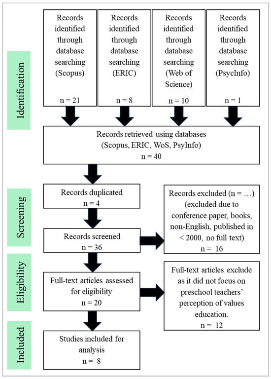 Four databases were used for this review: Scopus, ERIC ProQuest, Web of Science, and PsycINFO (Table 2). These databases were selected for their comprehensive coverage of research in education, social sciences, and psychology, disciplines that are closely related to VE. The search terms included: “Values Education”, “Moral Education”, “Character Education”, “Preschool”, “Kindergarten”, “Pre-school”, “Teacher”, “Educator”, “Opinion”, “View”, “Perception”, and “Perspective”. The use of multiple databases and a broad search strategy ensured that a wide range of relevant studies was captured for analysis.