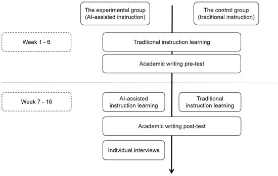 All participants were required to submit their writing samples for the pre-test at the end of Week 6. Participants in both groups were required to complete the post-test after finishing the 16-week course. Six participants from the experimental group were then invited to participate in the interviews on a voluntary basis after the post-test. The interviewees were selected based on their varied educational and cultural backgrounds, as well as their different performances during the course, to capture a range of perspectives on the role of AI-assisted learning in the development of their academic writing. Each interview lasted approximately 40 min, and the interviews were digitally recorded and transcribed. All interviews were conducted in Mandarin Chinese, and the excerpts presented in this manuscript were translated into English. To ensure accuracy and reliability, the translations were initially completed by the first author, a native Mandarin speaker, with careful attention to cultural and contextual differences. These translations were then cross-checked by an independent reviewer proficient in both Mandarin and English. In cases of ambiguity, the translations were revised through discussion to ensure clarity. The full study procedure is shown in Figure 1 below.