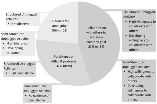 Participants’ engagement in unplugged, semi-structured activities did not facilitate persistence. Most of the participants’ responses related to persistence on difficult problems related to the structured activities. The comments made about the semi-structured activities related to it being easy. For example, one of the participants indicated that the unstructured activity was “interesting but not challenging” (participant quote), and another participant explained that the semi-structured activities are “easier because the instructions slow you down” (participant quote).