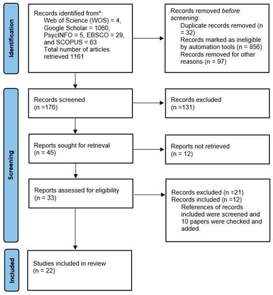 To address the above research questions, it was necessary to identify a sample of articles. The following electronic databases were selected for this purpose: Web of Science (WOS), PsycINFO, ScienceDirect, EBSCO, and SCOPUS. The following search string was used: (“augmentative and alternative communication” OR “assistive technology” OR “AAC”) AND (“specific learning disorder” OR “SLD” OR “dyslexia” OR “learning disorders”) AND (“reading disorder” OR “reading difficulty” OR “reading impairment”). The literature search process involved several stages, including identifying relevant studies aligned with our research aims, assessing their quality, identifying patterns and significant findings, and evaluating their relevance to the research questions. A total of 176 articles were identified, out of which 12 were selected based on the criteria. Due to the limited number of studies investigating the use of AAC in relation to SLDs, a further stage was added which involved screening the reference list of the 12 articles initially selected. The remaining 10 articles were added to provide further input to our SLR, resulting in a research sample of 22 papers. The selection process is shown in Figure 1.