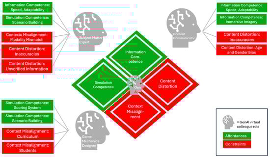 Four core areas of GenAI functionality were identified, namely information competence, simulation competence, content distortion, and context misalignment. These were interpreted either as beneficial (green in Figure 2) or challenging (red) to the design process. Furthermore, the analysis identified three distinct roles assigned to GenAI, which were subject matter expert, content communicator, and game mechanics designer. Certain identified benefits and challenges were specific to particular roles, as indicated in Figure 2.