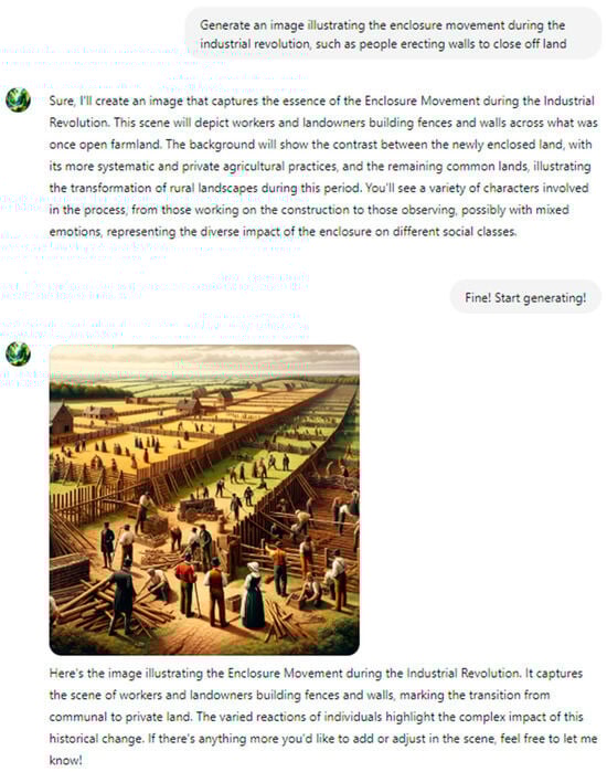 Another salient limitation was content distortion in the form of anachronisms. For example, an attempt to depict the 18th-century process of enclosure movement (land privatization) resulted in the introduction of anachronistic elements, such as a tractor (Figure 6).