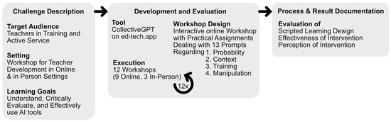 Research method visualization based on Schön and Ebner (2020). Challenge description, development of CollectiveGPT and workshop design, and evaluation process.