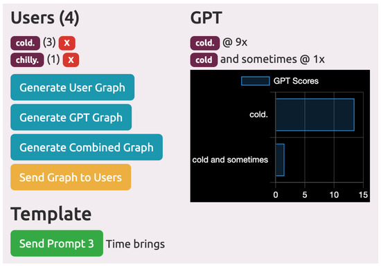 The workshop used a self-developed web tool designed to facilitate interactive and collaborative learning. Participants input their answers through a streamlined frontend interface, see Figure 2a, while the lecturer has access to a backend system, see Figure 3, that displays all submitted answers instantly. Identical answers are automatically grouped to simplify analysis and visualization and stored by a PHP2 based server-side application in the MaridDB3 database. The software was published as open source at https://github.com/ed-tech-at/CollectiveGPT (accessed on 6 February 2025).