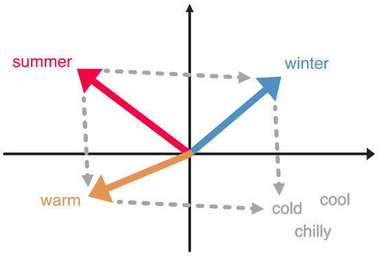Simplified illustration of the vectorization of words, where one dimension is encoding temperature (left: warm, right: cold) and one seasons (top: season, bottom: temperature states) (Brünner & Leitner, 2024).