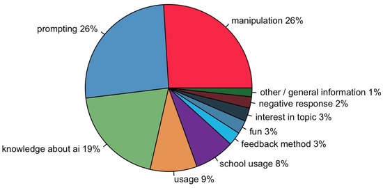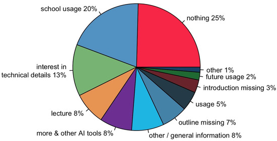 The most frequently mentioned area was related to the application of AI in schools, which accounted for 33% of the responses. This indicates a strong desire among the participants for deeper exploration of how generative AI can be integrated into educational settings.