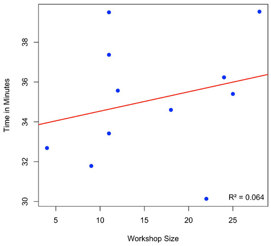 Relationship between workshop size and duration. The value of 0.064 indicates minimal correlation between workshop group size and time required for the workshop.