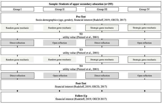 To find out how utility value can be increased through the instructional design of game mechanics and reflection prompts, a quasi-experimental study at upper secondary schools in Germany (n = 293) was conducted to improve the effectiveness of SGs and, thus, the instructional effectiveness of SGs in school-based financial education.