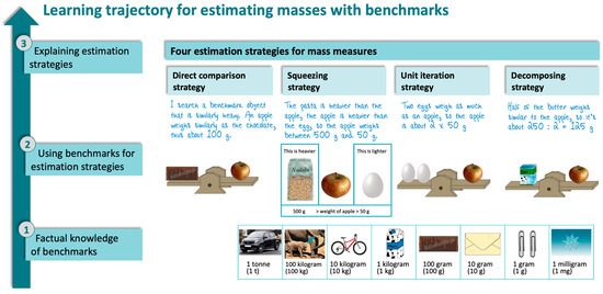 Following approaches by Sacristán et al. (2010) to structure learning opportunities in digital learning environments along a learning trajectory, we sequenced learning goals for mass estimation skills, as depicted in Figure 1. The first learning goal is to consolidate students’ factual benchmark knowledge by working towards a list of benchmarks objects to be memorized together with their mass measures. The second learning goal comprises four estimation strategies, all based on benchmark knowledge: direct comparison, unit iteration, decomposing into parts, and squeezing (Hildreth, 1983; Hoth et al., 2023; Joram et al., 1998).