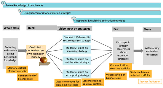 In summary, the following design principles for strategy instruction are worth investigation for their transferability to the instruction of measurement estimation strategies: collecting factual knowledge on benchmarks (Joram et al., 2005), starting with an inquiry phase for inviting students to invent own strategies (Rathgeb-Schnierer & Rechtsteiner, 2018) for high cognitive engagement, followed by a knowledge organization phase (Chi et al., 1994; Loibl et al., 2017) with explicit instruction through worked examples (Renkl, 2014; Heinze et al., 2020; Dignath & Büttner, 2018) with self-explanation prompts (Chi et al., 1994). Each of the phases can be scaffolded so that all students can engage in them (Hannafin et al., 1999; Lan et al., 2010). So far, little is known how these principles can be transferred to estimation strategies on measures (Subramaniam, 2014).