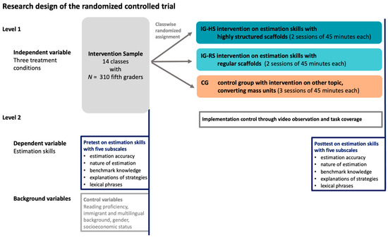 To pursue the research questions under ecologically valid conditions, a class-wise randomized controlled trial was conducted with 14 classes, with a total intervention sample of n = 310 students who completed the pretest and posttest. As an advance organizer, Figure 3 presents the pre-post-control group design with three treatment conditions to which classes were randomly assigned, using estimation skills as the dependent variable. In the following subsections, the methods of data gathering and data analysis are described.