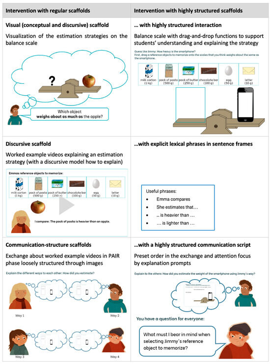 The digital teaching-learning environment (on the platform called divomath) with different kinds of scaffolds for estimating mass measures was successively developed in iterative design experiment cycles and their qualitative analysis so that more students could engage in challenging discussions (overview in Bielinski et al., 2024). When offering scaffolds, empirical research is needed to determine what exactly to scaffold and in which degree of prestructuring (Lajoie, 2005). While highly structured scaffolds might serve some students (Gibbons, 2002; Corno, 2008), they might unnecessarily lower demands for others (de Araujo & Smith, 2022; Sacristán et al., 2010), so the effects of highly structured and regular scaffolding should be investigated.