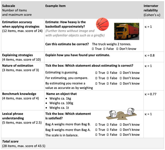 - Benchmark knowledge. Following Bright (1976), students’ benchmark knowledge was tested with four items demanding students to name objects of given weights such as 1 kilogram. Students’ benchmarks were rated as fitting or unfitting with a tolerance of ±25% so that a maximum score of 4 could be reached. Inter-rater reliability was tested for more than 20% of the data and reached Cohen’s κ = 0.77.