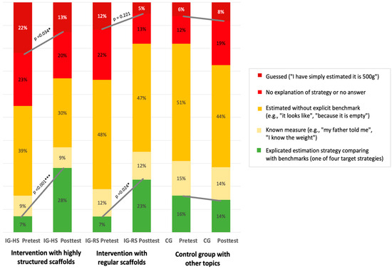 In total, a maximum score of 10 could be reached for explaining strategies. Inter-rater reliability was tested for 20% of the data and reached Cohen’s κ = 0.8. Beyond these scores, the explanations were also coded with respect to the articulated strategies to trace how the strategies developed from pretest to posttest; we coded no explanation of strategy and guessed and estimated without an explicit benchmark (e.g., “it looks like” and “because it is empty”), known by heart (e.g., “my father told me” and “I know the weight”), and an explicated estimation strategy comparing with benchmarks (i.e., the four target strategies from Figure 1).