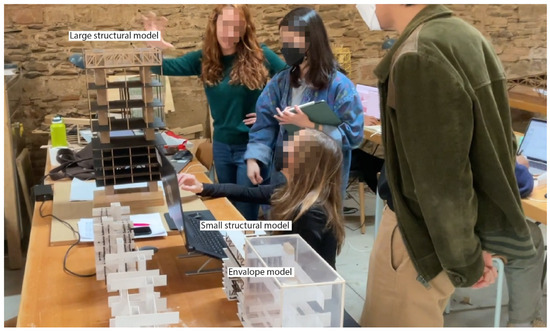 Sketch drawings, tracing paper, markers, two laptops, and one tablet were also present. The first laptop was used to communicate with the tutor via Zoom and had a slide presentation open, which contained images of a larger model of a building segment (hereafter referred to as the large structural model; see Figure 2) and a virtual detailed model representing structural and architectural ideas (hereafter referred to as the virtual developed model). Drawings of typical floors and images of case studies addressing structural issues were also included in the presentation. The tablet had the same presentation open but with presenter notes available for the students. The second laptop remained closed during the session. The tutor sat near a table in her studio and communicated with the students using a tablet and digital pen.