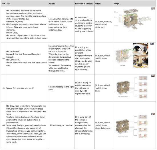 In this extract (see Figure 4), Eli, the tutor, attempts to focus the students’ attention on a structural issue she has identified (line 43). She uses her digital pen to draw on the screen to indicate the places that need more structural support. However, she realizes that the virtual model image she uses does not provide a good context for her drawing and, therefore, requests that the students locate a suitable 2D plan for her. While searching for that plan in other slides, the students need to remove the sketches drawn by Eli (line 44) because they derive their meaning from the virtual model image that served as the background for Eli’s drawings. Suzan searches for the slide she believes would assist and asks Eli to verify that it has the necessary information (Line 45). Eli confirms that this slide includes the required plan, marks the plan with her digital pen to draw the student’s attention to the correct location on the slide, and then marks the area where she identifies the problem. Then, she marks new pillars on the plan, stating, “So you can have pillars, these, here, under the trusses. Yeah, you can have some pillar there” (Line 46).