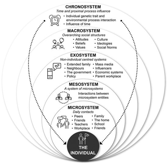 The model describes five interconnected systems, presented in layers, much like those of an onion. Each layer represents a component of the ecosystem surrounding an individual, each influencing the person while interconnecting with each other. Working outwards, the systems are the microsystem (immediate context of the individual, for example, school, peers, family), mesosystem (influences from two or more aspects of the microsystems connecting, for example, parents and peer relationships), exosystem (informal and formal social and other structures impacting beyond the immediate individual, for example, neighbors, wider community, social services), macrosystem (broad socioeconomic, cultural attitudes, social and political context, for example, values, attitudes, culture), and chronosystem, (major historical events, life transitions, environmental events, for example, divorce, pandemic, war, death of loved one). The impacts on the individual are multi-directional, emphasizing that each system impacts on the others, and ultimately on the individual at the center. In this study, we call upon Bronfenbrenner’s bioecological systems theory as a lens to discuss the findings of the systematic literature review.