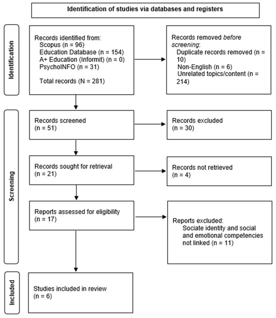 After the first level screening (title and abstract), 51 papers remained. Second level screening of these papers was undertaken by two of the authors and involved reviewing the full journal article to determine alignment of the scholarship to the overarching concepts and research intentions of the scoping review (i.e., focused on social-emotional competencies, identity formation and/or socio-ecological dimensions). A total of 17 papers were retained for the analysis stage. Following a close analysis of the final 17 papers, only six articles explicitly explored/had empirical data linking social and emotional skills and positive identity formation. Figure 2 shows the flow of the screening process with numerical values.
