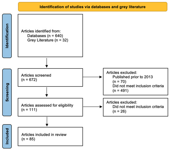- Tricco, A. C., Lillie, E., Zarin, W., O’Brien, K. K., Colquhoun, H., Levac, D., Moher, D., Peters, M. D. J., Horsley, T., Weeks, L., Hempel, S., Akl, E. A., Chang, C., McGowan, J., Stewart, L., Hartling, L., Aldcroft, A., Wilson, M. G., Garritty, C., Lewin, S., … Straus, S. E. (2018). PRISMA Extension for Scoping Reviews (PRISMA-ScR): Checklist and Explanation. Annals of Internal Medicine, 169(7), 467–473. [Google Scholar] [CrossRef] [PubMed]