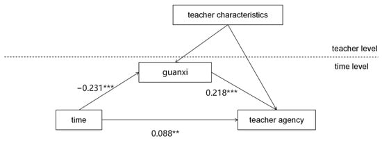 To further explore the role of guanxi in the impact of performance-based personnel management on teacher agency, we established a path analysis model (Model 3), with time as the independent variable, guanxi as the mediating variable, and teacher agency as the dependent variable. The results were shown in Table 5. When controlling for teachers’ characteristics, guanxi significantly decreased over time (B = −0.231, p = 0.000). Additionally, guanxi had a significant positive effect on teacher agency (B = 0.218, p = 0.000).