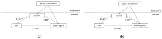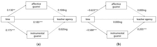 Building on the results from Model 2, we further examined the heterogeneity across groups with varying levels of initial guanxi. First, Model 4, which used a sample of teachers with weaker initial guanxi, was shown in Figure 3a. The results indicated that in this group, guanxi partially mediated the impact of performance-based personnel management on teacher agency. In fact, the implementation of performance-based personnel management promoted both guanxi (B = 0.176, p = 0.000) and teacher agency (B = 0.18, p = 0.000). However, the effect of guanxi on teacher agency in this group is relatively weak (B = 0.141, p = 0.042), and the partial mediation effect is 14.20%. In contrast, the results of Model 5 for teachers with stronger initial guanxi (see Figure 3b) showed that guanxi fully mediated the relationship between performance-based personnel management and teacher agency. In this group, time had no significant effect on teacher agency (B = 0.016, p > 0.05), guanxi significantly decreased over time (B = −0.612, p = 0.000), and teacher agency increased with guanxi (B = 0.222, p = 0.000). The heterogeneity analysis revealed that performance-based personnel management had different effects across groups. Although they strengthened the relationships of teachers with weaker initial guanxi, these relationships were less effective in promoting teacher agency. Meanwhile, performance-based personnel management indirectly negatively affected teacher agency by undermining the guanxi of teachers with stronger initial guanxi.