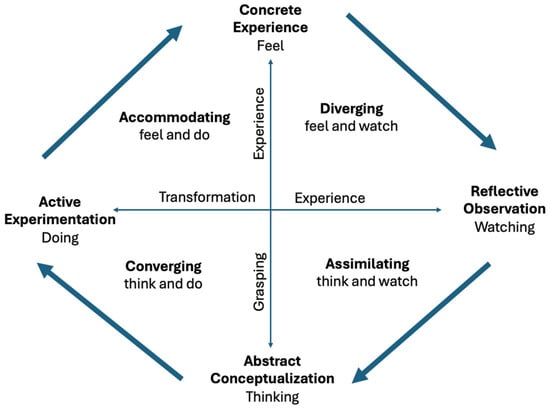 Kolb’s experiential learning cycle, illustrating the four stages of learning—concrete experience, reflective observation, abstract conceptualization, and active experimentation—along with the associated learning styles (Diverging, Assimilating, Converging, and Accommodating) based on how individuals process and apply experiences. Concrete experience: immersion in a direct experience.
