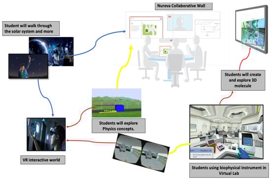At California State University Dominguez Hills (CSUDH), VR is explored as a teaching modality using the platform Engage as a tool in face-to-face classrooms to enrich the learning experience. Figure 2 shows how adaptive technologies such as XR can be used in the classroom to create immersive learning experiences and enhance student engagement.