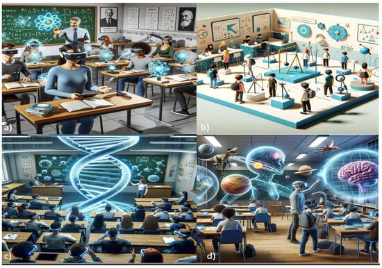 AI-generated image of XR environment. (a) This scene depicts students wearing VR headsets and interacting with 3D holographic models of physics concepts. (b) This scene shows basic avatars of students in a virtual environment, interacting with elementary physics models. (c) This image clearly depicts an augmented reality (AR) scenario in a learning environment, focusing on a large virtual object imposed onto the physical world. The image shows students observing a large 3D holographic model of a DNA double helix in their classroom. (d) This diagram depicts students engaged in learning using mixed reality (MR) technology. Students are interacting with large virtual objects that are seamlessly integrated into their physical environment.