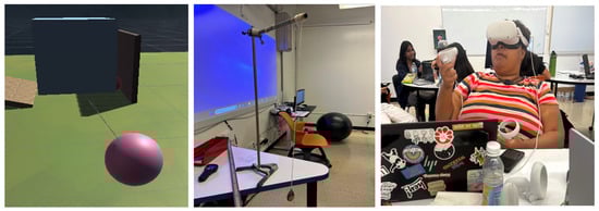 Description: CSUDH introduced a pilot course utilizing VR as a teaching modality for calculus-based physics (see Figure 5). The course was offered across three semesters to a cohort of 105 students. The implementation of VR aimed to enhance the conceptual understanding and engagement of students by immersing them in interactive 3D environments that elucidate complex physical phenomena. The VR curriculum was combined with traditional teaching methods to create a blended learning experience. This approach integrated the immersive and interactive capabilities of VR with conventional teaching strategies, such as lectures, textbooks, classroom discussions, videos, and hands-on activities. The goal was to leverage the strengths of both methods, using VR to enhance engagement and provide visual and experiential learning opportunities, while traditional methods offered structure, foundational knowledge, and guided instruction. This blended approach aimed to create a comprehensive and effective learning environment that caters to diverse learning styles and improves overall educational outcomes.