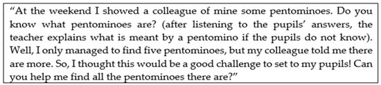 Júlia began the research lesson by presenting the task to the pupils. Given that they did not know the concept of a pentomino, as anticipated, she decided to clarify this aspect without giving them too much information or leading them to an answer to the task. She begun with three confirmation questions and then explained what a pentomino is and presented the task: