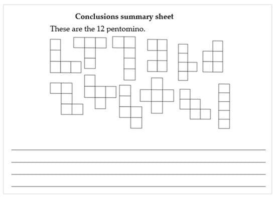 As suggested by Júlia, each group of pupils was given five equal squares so that they could manipulate them and build the various pentominoes, and a sheet to draw each construction they made. Larger squares were made available for the pupils to present their answers to their colleagues on the board during the whole-class discussion. To promote the final synthesis, the preservice teachers decided to explore with the pupils the conclusions summary sheet shown in Figure 2, which shows the twelve possible pentomino shapes and includes a space to fill in with suggestions from the pupils about the main mathematical ideas explored in the lesson, particularly relating the concepts of area and equivalent figures to pentomino shapes.