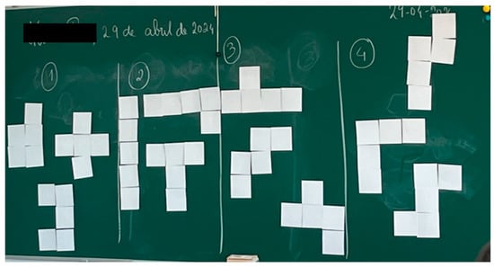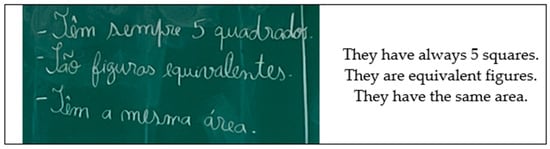 In this segment of the final synthesis, Júlia encouraged the pupils to get involved, and they spoke up when she posed them mostly confirmation and focusing questions, reviewing the characteristics of the pentominoes, namely the fact that they all have the same area and are, therefore, equivalent figures. At the end of the final synthesis, Júlia made a record on the board (Figure 5) summarising the main ideas explored in the lesson and highlighting the relationship between pentominoes and the concepts of area and of equivalent figures.