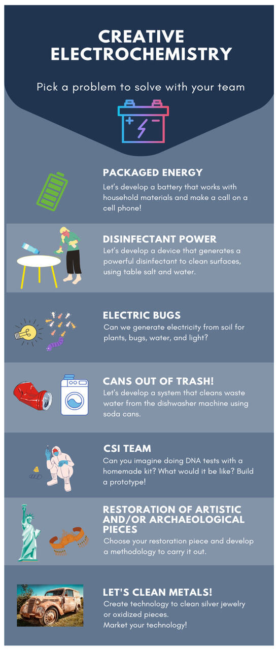 Students should approach the study of building an electrochemical cell, galvanic or electrolytic, depending on their chosen problem. Figure 1 presents the problems offered to students, who must justify their choice of materials and operating details by applying electrochemical knowledge acquired in the course. As they build their devices, students develop the necessary skills to elucidate how the electrochemical device works. When theoretical predictions do not match experimental observations and data, students must be able to explain the set conditions that could be involved. Their challenge is to develop electrochemical thinking that incorporates the complexity of real systems.