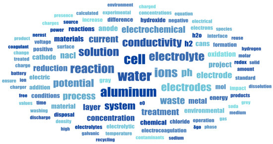 The Word Cloud in Figure 3 illustrates the most frequent terms used by students, after leaving only those words directly related to the problem and content knowledge. It shows the students’ language in all five teams on their final report. Subject matter language can be recognized, as well as elements associated with the different categories of analysis. The most frequent words show a complete picture of the electrochemical discussion in the specific context of wastewater treatment using aluminum electrodes.