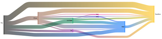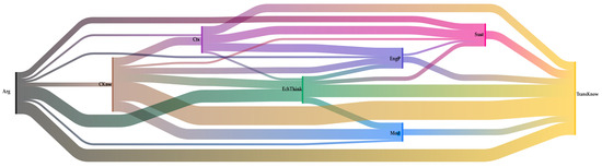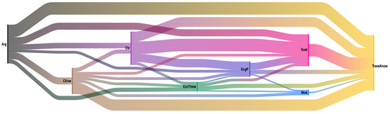 Another element that can be analyzed is how codes are interrelated; this phenomenon is called co-occurrence. To perform this, the Sankey diagrams represent two general ideas: the frequency of each code (occurrence), indicated by the thickness of the flow lines, and how these codes relate to each other (co—occurrences). Figure 5 shows the Sankey diagram for the co-occurrences of the “Aluminiums” team. This type of diagram represents the complexity of thinking the students acquire. In this case, as in all teams, the most recurrent codes were argumentation (Arg) and transversal knowledge (TransKnw), so it was of interest to know which other codes were related to these.