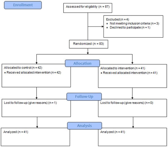 Initially, 87 children in the first cycle of Primary Education were contacted, of whom 83 expressed their interest in participating and met the established criteria. The inclusion requirements were as follows: (i) school-aged children in the first cycle of Primary Education; (ii) students able to perform moderate physical activity without medical restrictions and who could handle the abacus; (iii) voluntary participation, with informed consent signed by parents or guardians. Exclusion criteria included the following: (i) children with health problems that prevented them from safely performing physical activity or using the abacus (for example, heart disease, severe respiratory problems, or motor disabilities that made physical activity difficult); (ii) students with severe cognitive or learning disabilities that significantly interfered with the use of the abacus or the possibility of benefiting from the intervention; (iii) children participating in other extracurricular programs focused on physical or cognitive training, in order to avoid interference from other interventions. Finally, a total of 82 children from the first cycle of Primary Education with an average age of 6.67 ± 1.02 years agreed to participate, of which 48 were boys (58.50%) and 34 were girls (41.50%) (Figure 1).