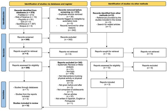 Figure 1 shows a flowchart summarising the most important results of the search carried out. After searching for the different studies in each database, with the filters applied, we obtained an initial 579 documents from (1) PubMed (n = 213); (2) Web of Science (n = 10); (3) PsycINFO (n = 81); (4) ERIC (n = 3); (5) SPORTDiscus full text (n = 267); and (6) SCOPUS (n = 5) for examination. These reports were then subjected to a screening and analysis based on reading the titles and abstracts in order to select research papers in accordance with the subject matter presented. After this first screening, a total of 572 documents were excluded for the following reasons: (1) duplicates (n = 30); (2) they were systematic reviews or meta-analyses (n = 21); (3) they did not correspond to the topic (n = 476); (4) they did not implement interventions that involved physical activity, physical exercise, or sport (n = 3); (5) Pre- and post-test measures were not given (n = 3); (6) the sample was not composed of young people or adolescents (n = 1); (7) they were not articles (n = 37); and (8) it was not written in Spanish, English, or Portuguese (n = 1). In this way, a total of seven articles from the different databases were included. On the other hand, 12 more studies were identified via other methods (after examining the references of the included articles and searching for related articles in the databases analysed), as follows: reports extracted through reference lists (n = 5) and (2) studies selected by searching for articles related to previously selected documents in the databases (n = 7). Of these 12 studies, after analysing the title and abstract and the screening process, 3 articles were included in the study. Finally, a total of 10 publications were included in the review, in which interventions that were carried out through programmes based on the practice of physical activity, physical exercise, or sport were implemented with the aim of preventing the use of tobacco, alcohol, and/or drugs in young people and adolescents.