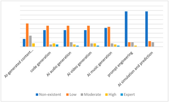 Knowledge of specific applications, such as AI-generated content detection, code generation, AI audio generation, AI video generation, AI music generation, prompt engineering, and AI simulations and predictions, has low usage rates, indicating that mastery of advanced AI skills is less common (Figure 1).