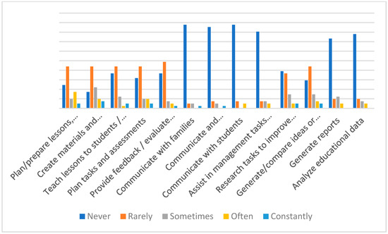 Lesson planning (22% often or constantly) and creating materials (17.1% often or constantly) for students are the most common purposes for using AI, which represent a significant plurality. This pattern suggests that teachers are primarily integrating AI to optimize the design and development of pedagogical content. Teachers prioritize the pedagogical applications of AI over its potential for research and communication with stakeholders (families, colleagues, and students), as evidenced by lower ratings in these latter areas (Figure 2).