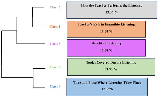 The DHC divided the entire corpus into 450 ECUs. The results of the analysis showed two main groups of clusters (Figure 1). The first group was focused on the characteristics of teacher listening and the benefits of listening for both students and teachers (Classes 1, 2 and 5). The second group provides information on the time and place of listening, as well as the topics most frequently discussed (Classes 3 and 4). The main results found in each of the classes are presented below. The words that appear in bold below in each of the classes are significant due to their frequency in each of the ECUs, and all of these significant words areare compiled in Figure 2. The main results found in each of the classes are presented below.