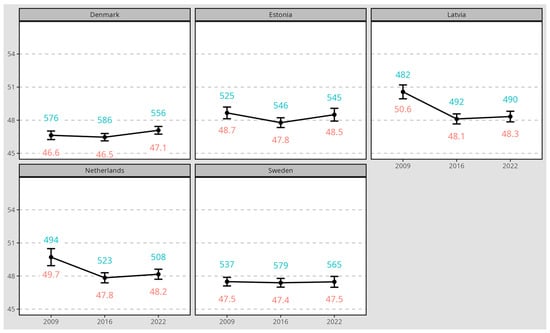 Figure 3 with large changes in students’ expected participation in illegal protest activities over the cycles of ICCS. In these figures, the numbers in blue represent the average civic achievement scores, the numbers in orange represent the average on the intended future illegal protest participation scale. In Denmark, Estonia, Latvia, the Netherlands, and Sweden, the changes are very small. In Latvia, the overall changes across the cycles are even negative. In Denmark, the average is insignificantly higher in 2016 compared to 2009, and in 2022, it increases significantly, but it is just 0.63 points. In Estonia, the average first decreases significantly from 2009 and then increases significantly from 2016 to 2022, reaching approximately the same level as 2009 (no significant difference between 2009 and 2022). In Latvia, the level drops significantly from 2009 to 2016 by 2.5 points and remains about the same in 2022 (insignificant difference between 2016 and 2022). The trends in the Netherlands are the same as those in Latvia. In Sweden, the levels of expected student participation in illegal protest activities change only by up to 0.10 points across the three cycles, and none of the changes is significant.